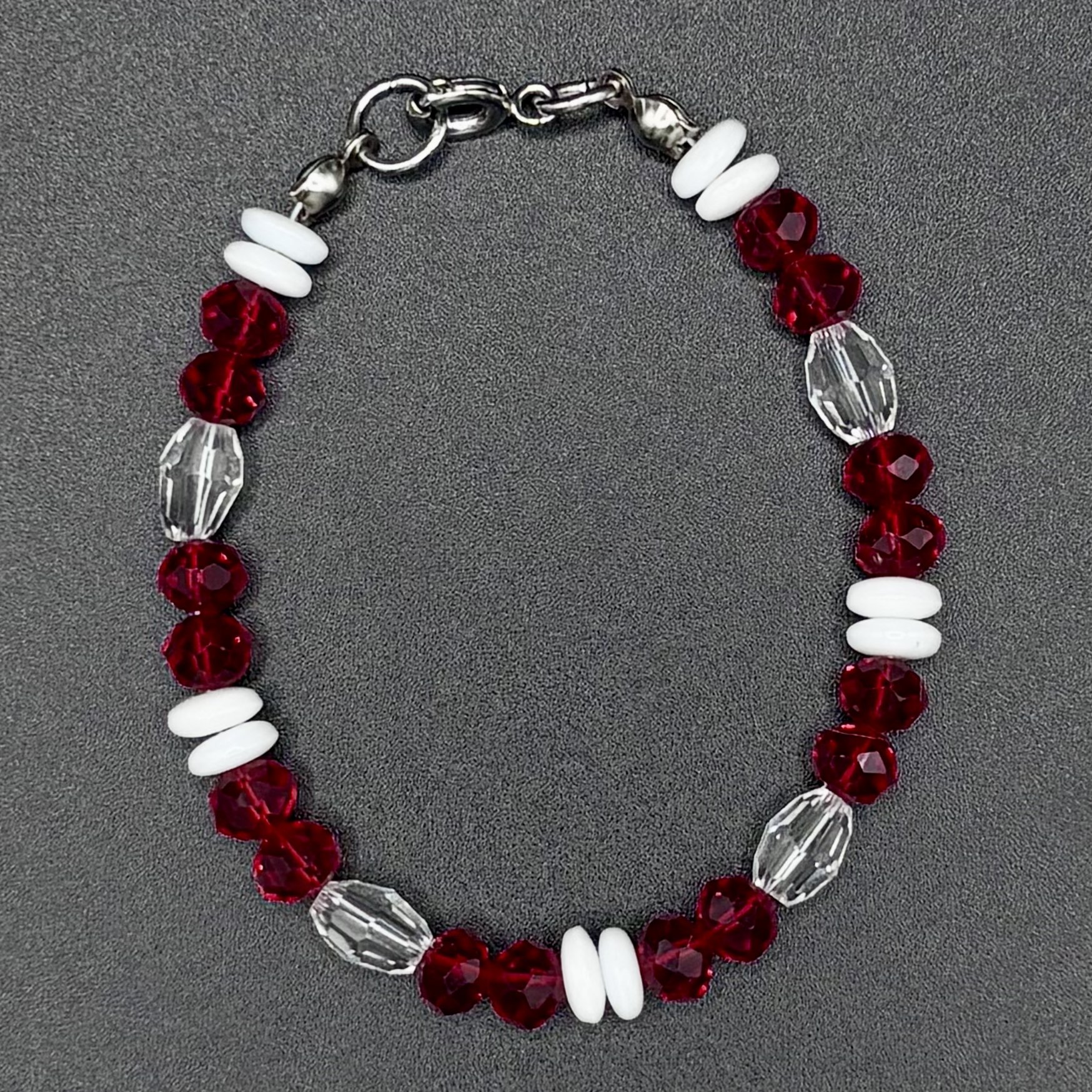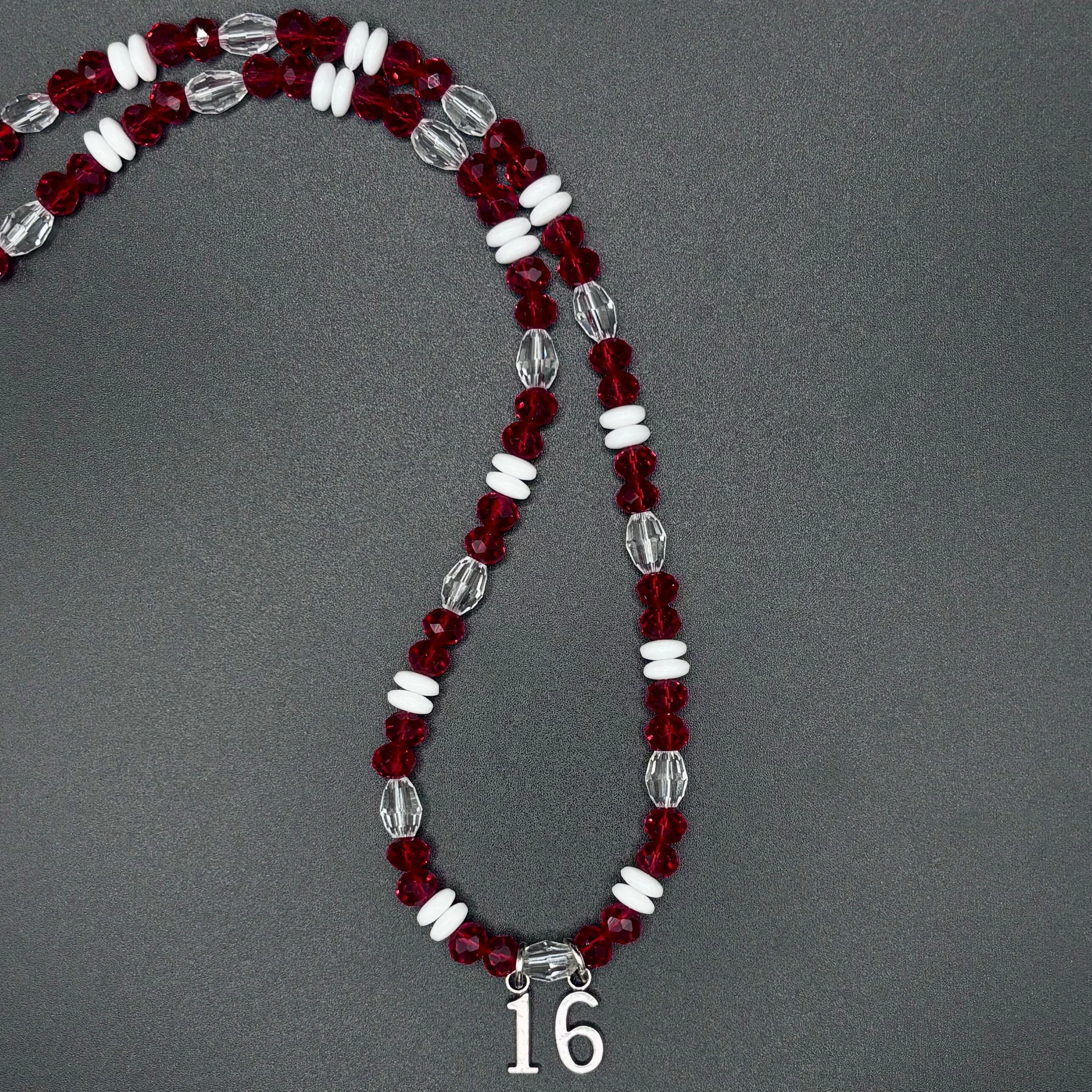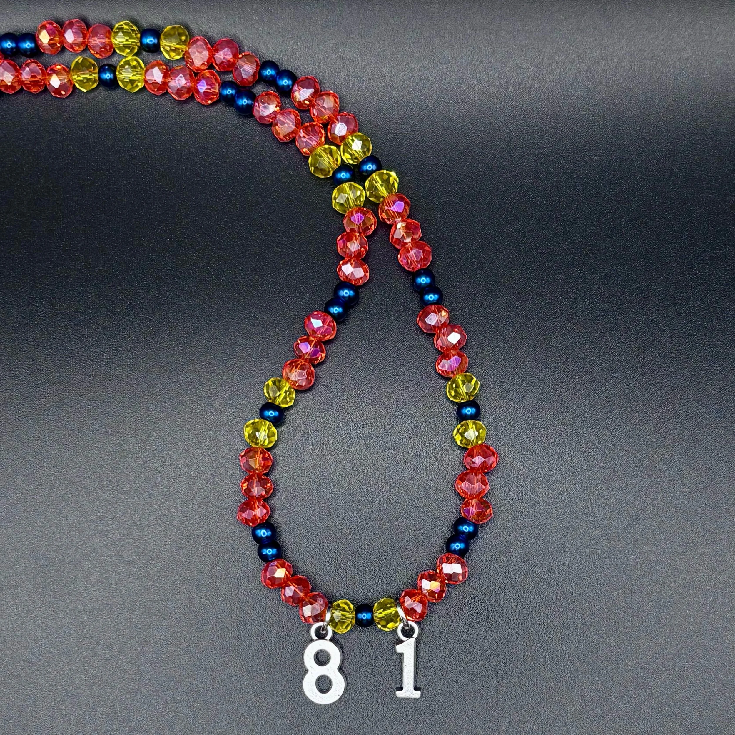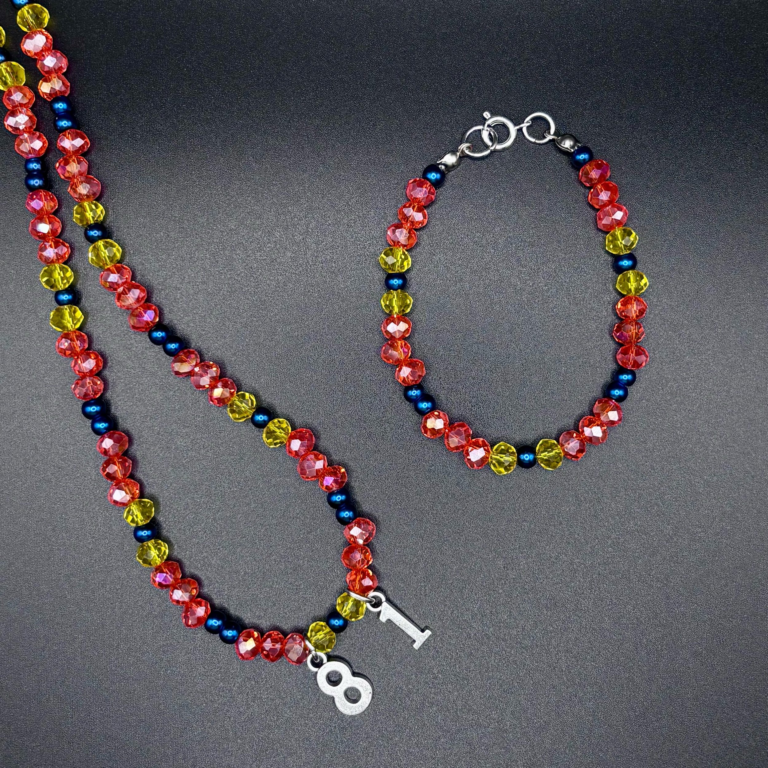 This Ferrari-inspired set is a nod to Charles Leclerc’s iconic helmet — striking red, crisp white, and full of quiet intensity. With faceted red crystal and glossy white shell beads, this necklace and bracelet duo is bold but refined, like Charles himself. Finished with a silver #16 charm and sleek silver hardware, it’s a set for fans who love with their whole heart — even when it hurts.